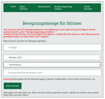 WICHTIG: Bitte tun Sie dies nur, wenn Sie ganz sicher sind, dass Sie in diesem Verband in der laufenden Saison keine Flächen mehr beregnen, denn die Eingabemaske wird für diesen Verband dann gesperrt und es sind keine weiteren Meldungen in dieser Saison für diesen Verband mehr möglich!