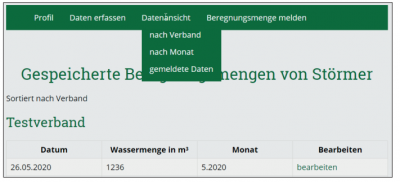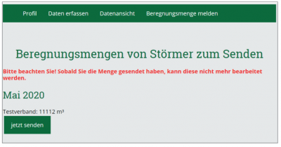 Hier sehen Sie die von Ihnen gespeicherten Beregnungsmengen, sortiert nach Monat. Wenn Sie einen Monat vollständig erfasst haben, klicken Sie auf „jetzt senden“. Nun werden die Beregnungsdaten in die Datenbank des Dachverbands übertragen und sind von Ihnen nicht mehr änderbar.